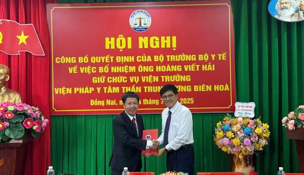 Tại buổi lễ, Phó GS, TS. Nguyễn Tuấn Hưng - Phó Vụ trưởng Vụ Tổ chức cán bộ được ủy quyền của Bộ trưởng Bộ Y tế đã trao Quyết định số 2255/QĐ-BYT ngày 07/7/2025 của Bộ trưởng Bộ Y tế bổ nhiệm BSCKII Hoàng Viết Hải giữ chức vụ Viện trưởng Viện Pháp y tâm thần Trung ương Biên Hòa.